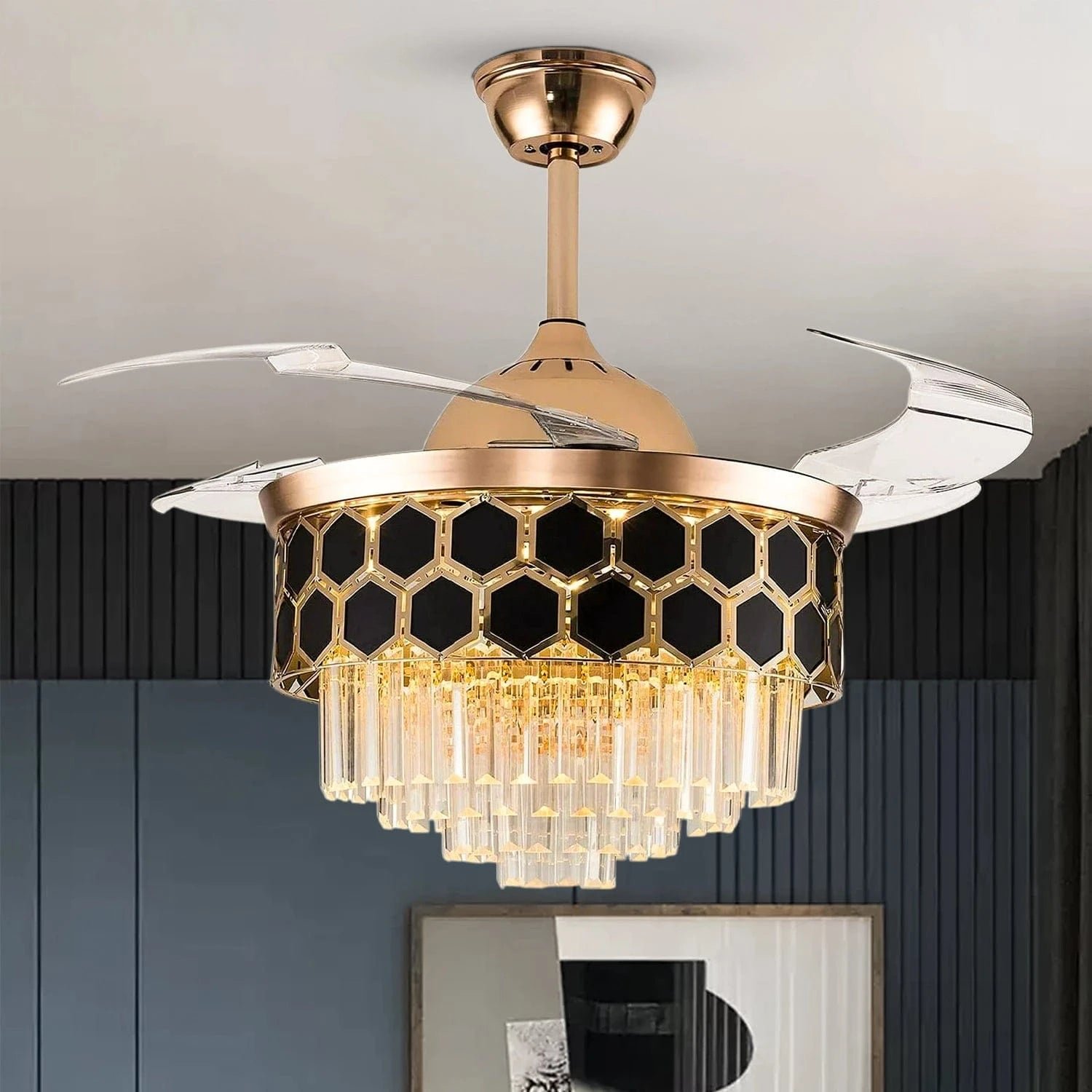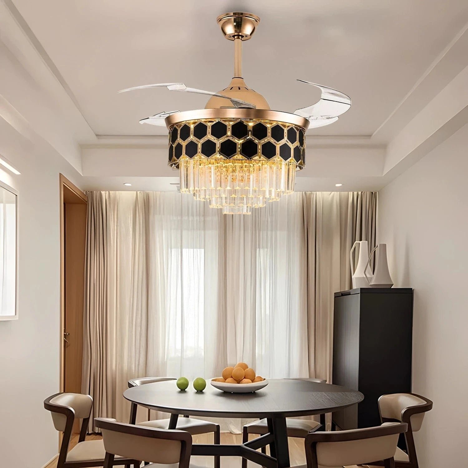 The chandelier features a modern lighting style that blends easily with different interiors. The crystal elements reflect light beautifully, creating a warm and inviting atmosphere. At the same time, the fan keeps your space cool without compromising on style, making it a perfect balance of luxury lighting and functionality.