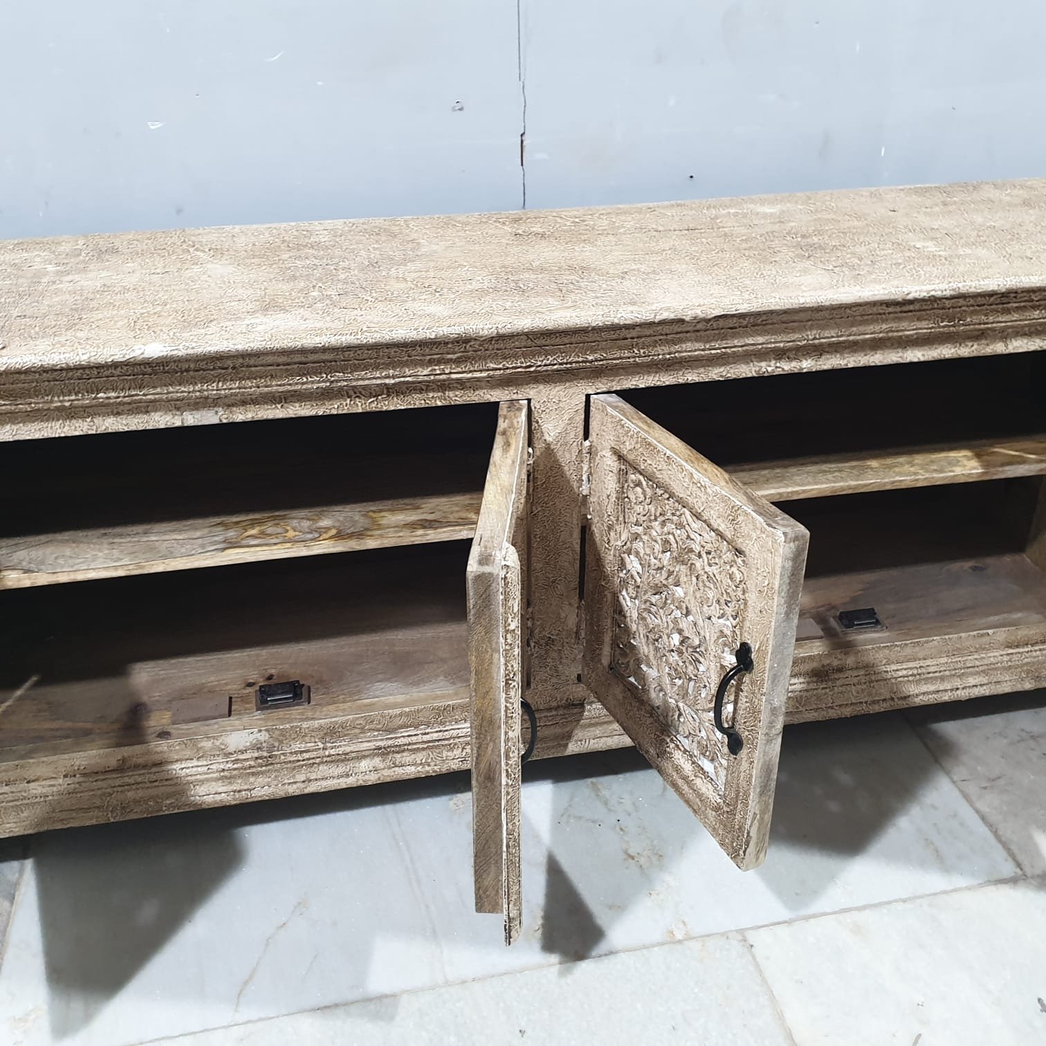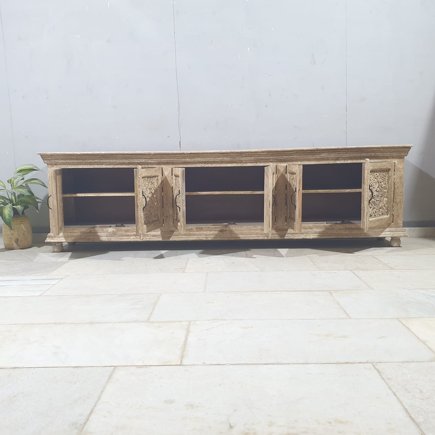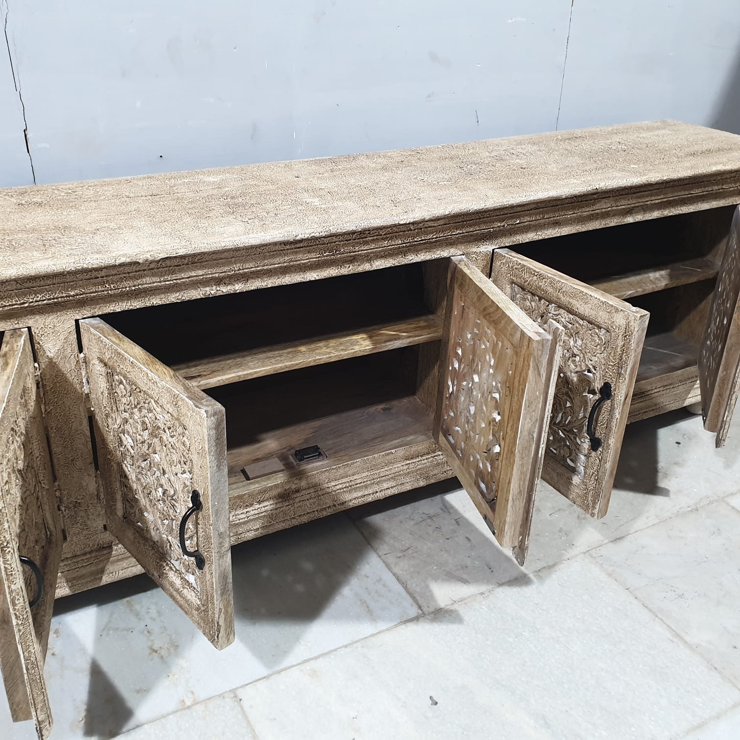 The Blue City Decor Heritage Carved 4-Door TV Console brings traditional craftsmanship and modern function together for a beautiful living room centerpiece. Handcrafted from high-quality solid wood, this elegant wooden TV unit features detailed carvings on each door, adding a classic and premium touch to your interior décor. Its strong build and timeless design make it perfect for everyday use.
