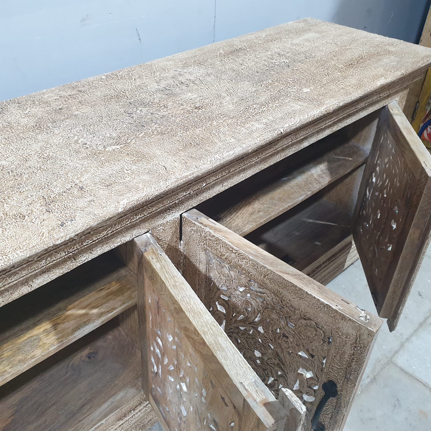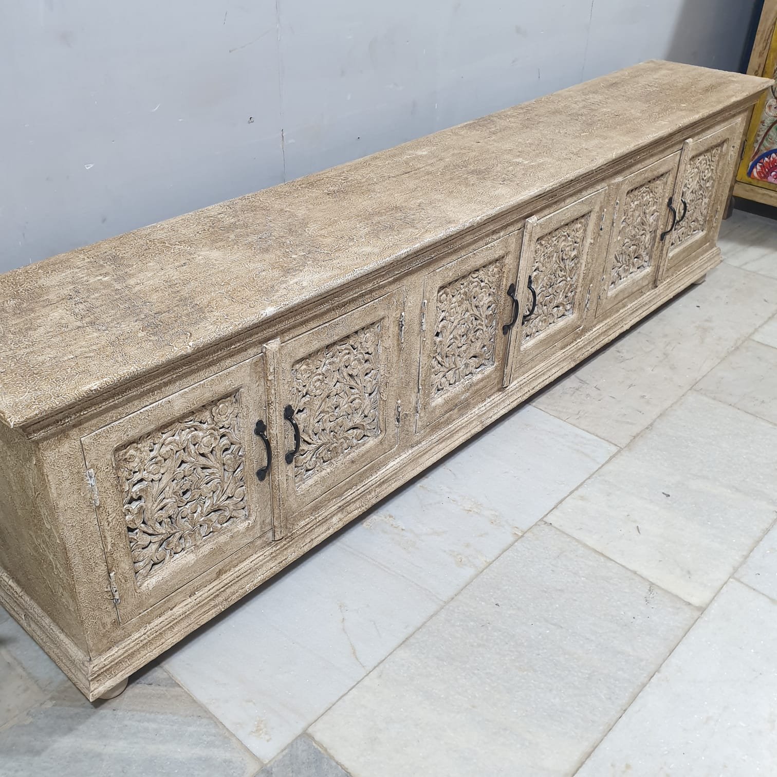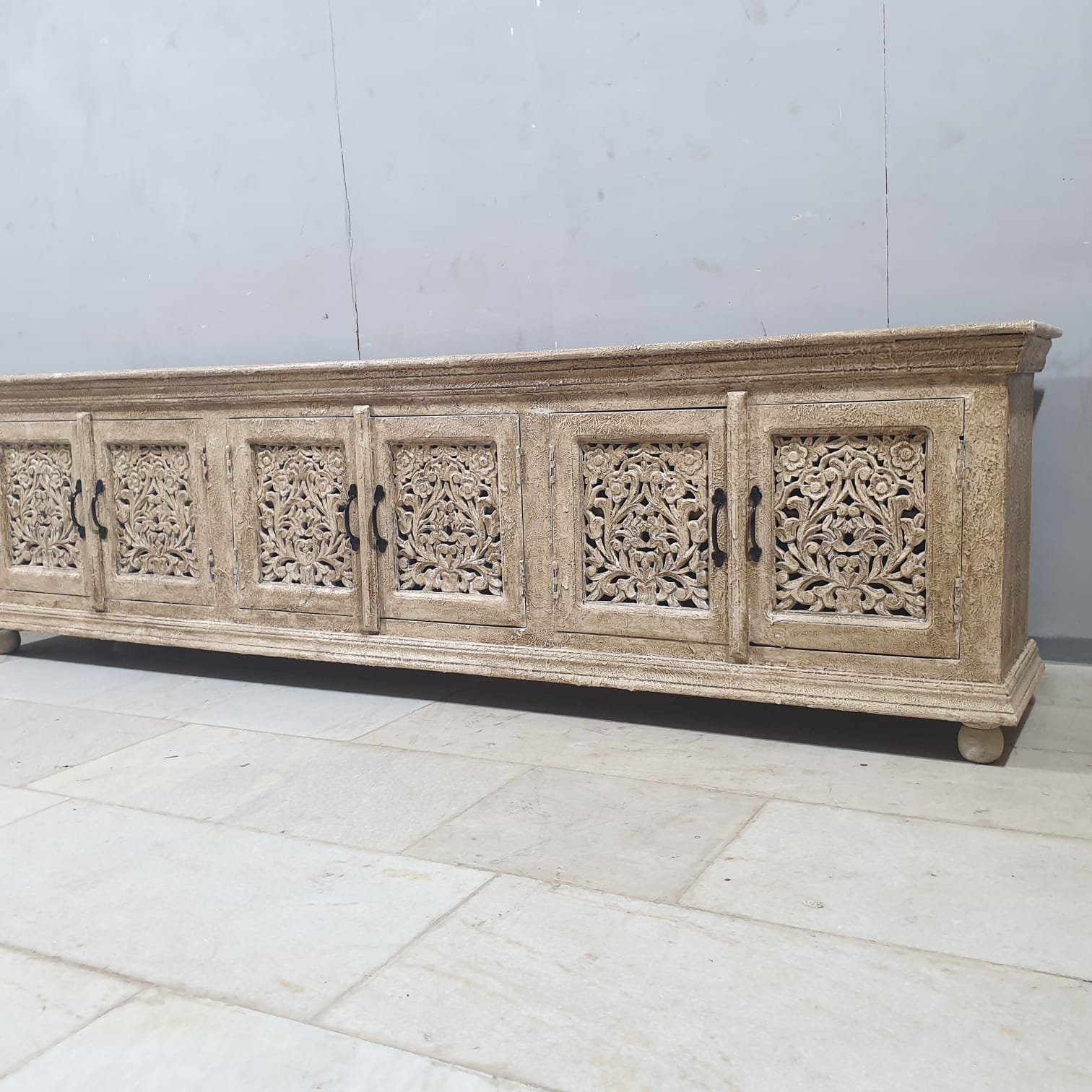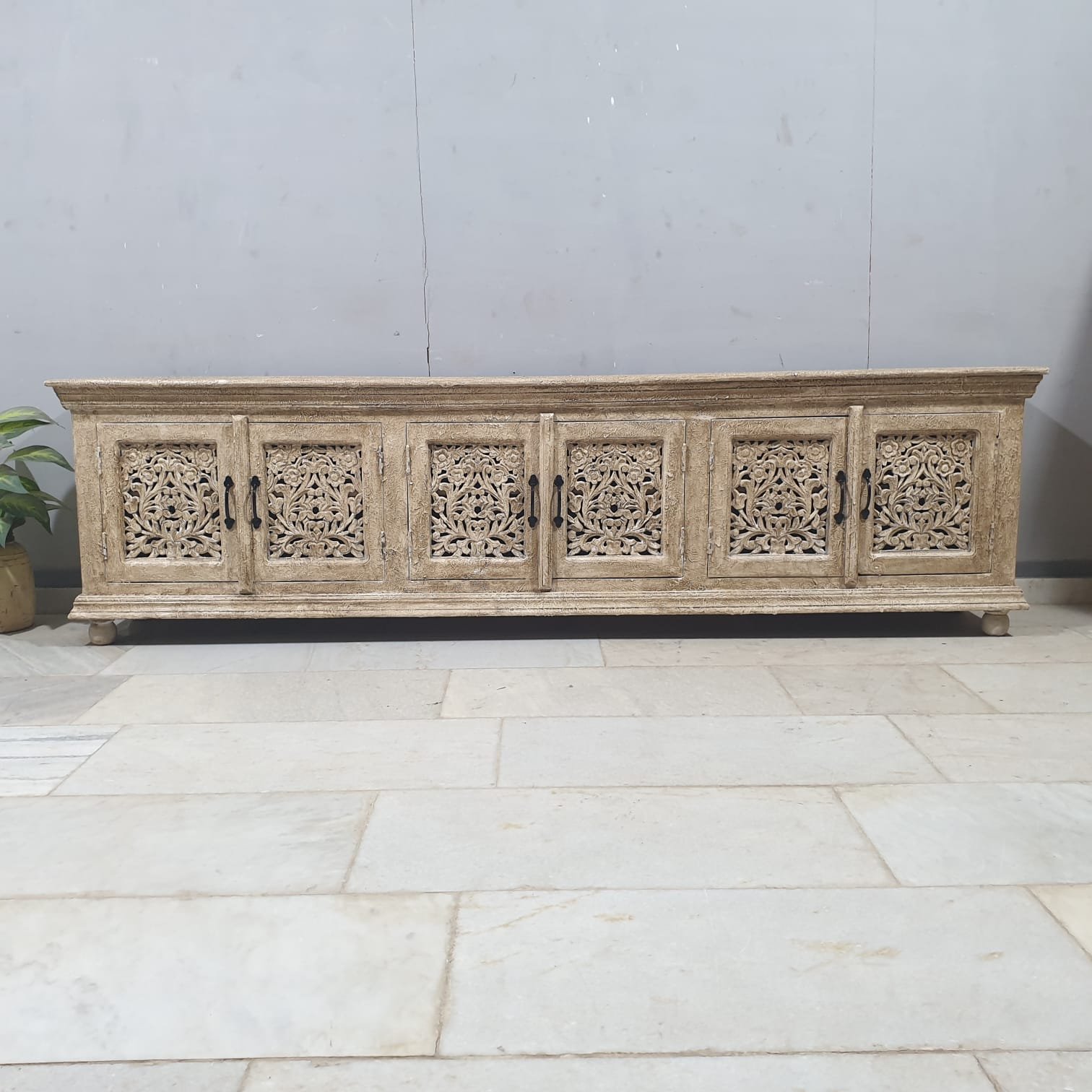 The Blue City Decor Heritage Carved 4-Door TV Console brings traditional craftsmanship and modern function together for a beautiful living room centerpiece. Handcrafted from high-quality solid wood, this elegant wooden TV unit features detailed carvings on each door, adding a classic and premium touch to your interior décor. Its strong build and timeless design make it perfect for everyday use.
