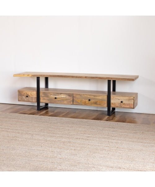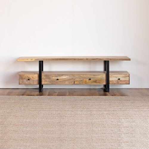 If you want stylish, durable, and functional solid wood furniture, the Industrial Mango Wood TV Cabinet from Blue City Decor is an excellent choice for your living room.