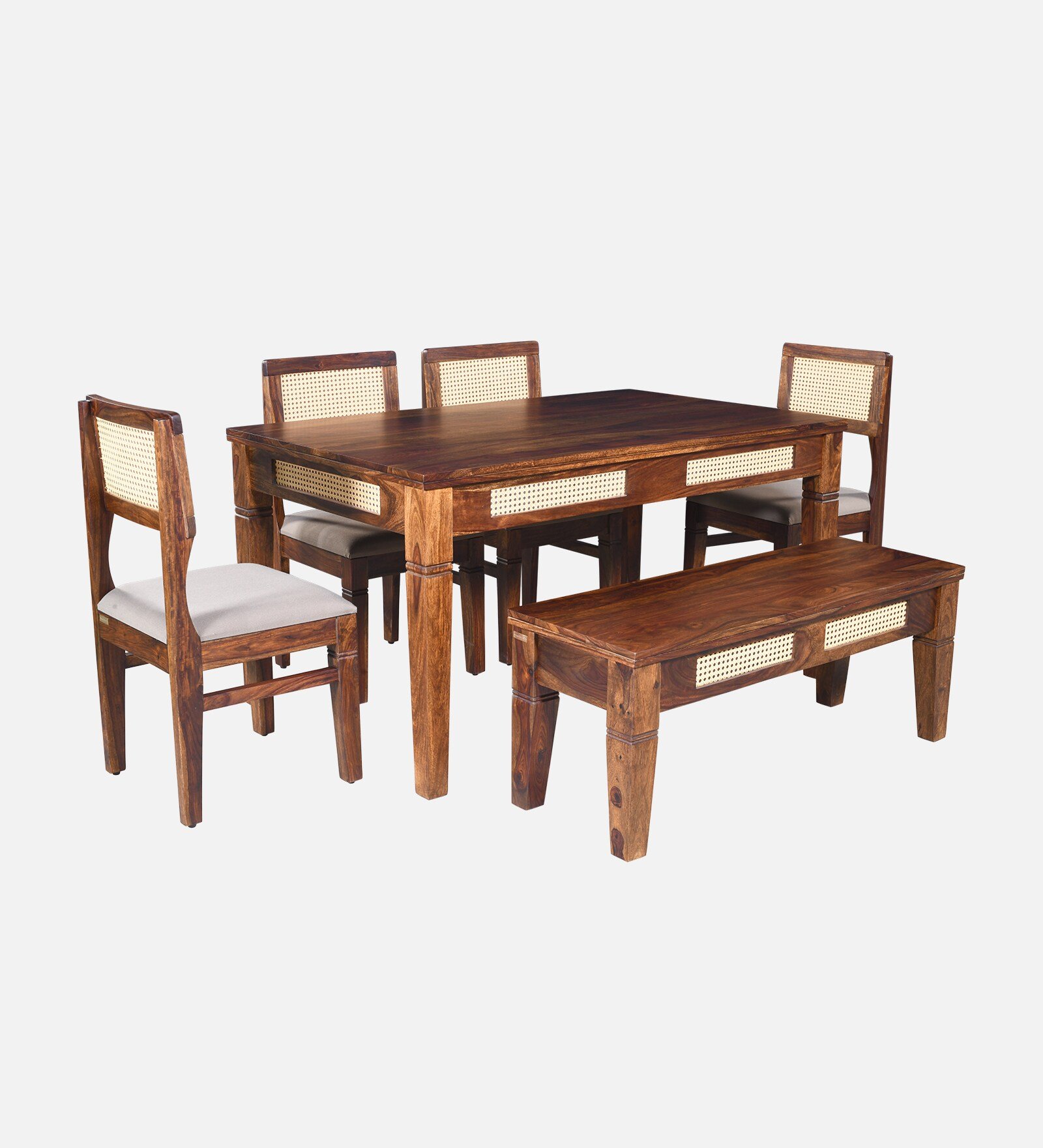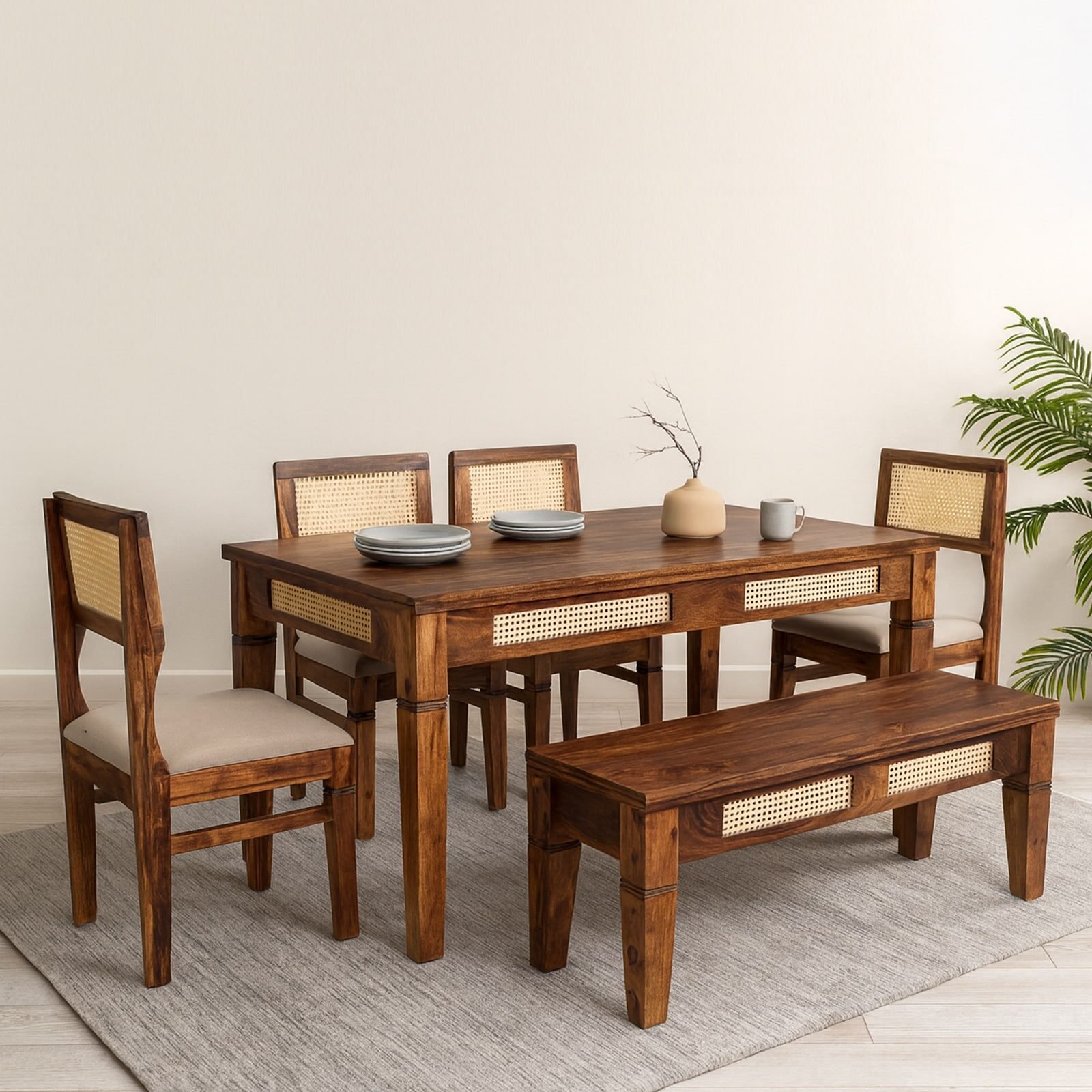 The Blue City Decor Kairo Sheesham Wood 6 Seater Dining Set with Bench in Teak Finish is designed to bring comfort, style, and durability to your home. Crafted from high quality solid wood furniture, this elegant wooden dining set offers strength and long-lasting performance. The teak finish enhances the natural grain of sheesham wood and gives the set a rich and warm look.