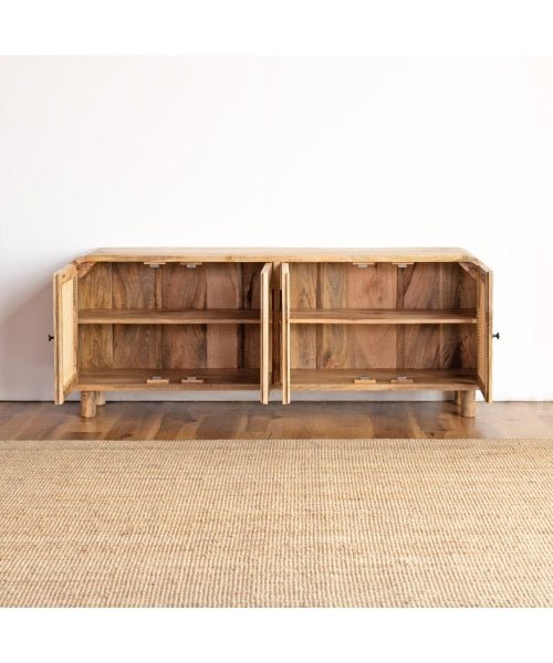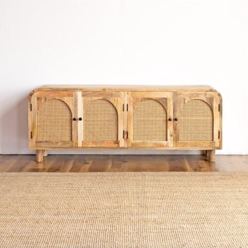 The Blue City Decor Mango Weave Media TV Stand blends natural materials, clean design, and everyday practicality to elevate your living space. Crafted from high-quality solid wood, this elegant wooden TV unit features hand-woven rattan panels that add warmth, texture, and a relaxed organic feel. The natural mango wood grains stand out beautifully, giving each piece its own unique character.