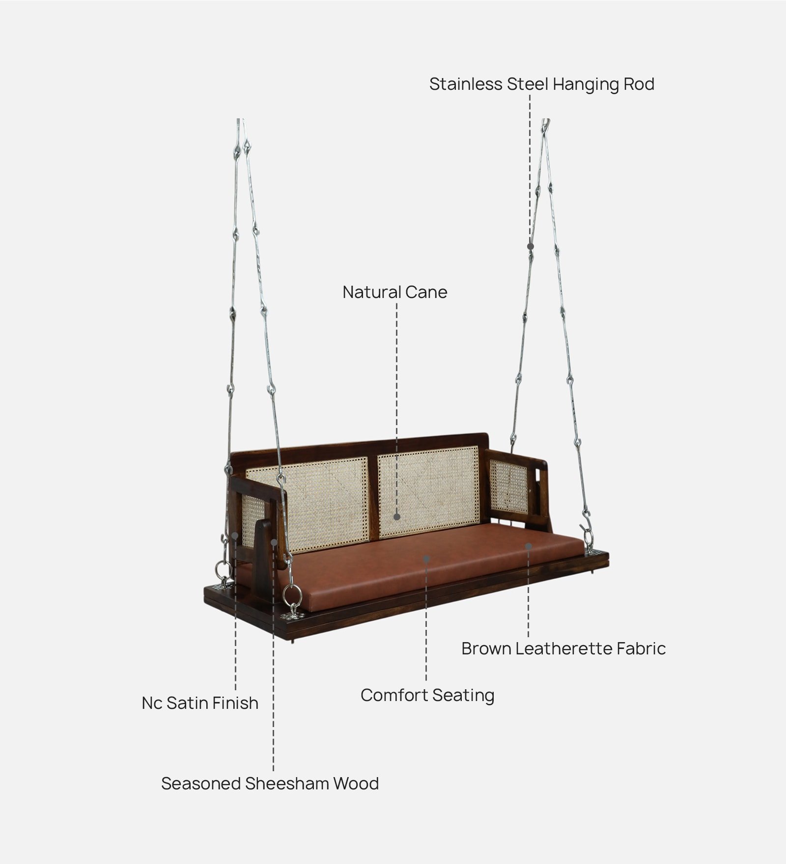This two seater swing creates a cozy and relaxing seating space for your home. You can place it as part of your living room furniture to enjoy peaceful moments with your family or guests. The wide seating area provides comfort, while the sturdy frame ensures stability and safety for everyday use.