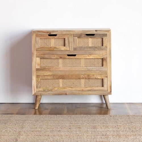 The Blue City Decor Rattan Luxe Wooden Chest of Drawers brings natural beauty and functional design into your home. Made from solid wood, this chest offers strength, durability, and a warm aesthetic that enhances any interior. The natural rattan cane weave on the drawer fronts adds a stylish touch, giving the piece a light and airy feel. It works well in both living room furniture and bedroom furniture settings.