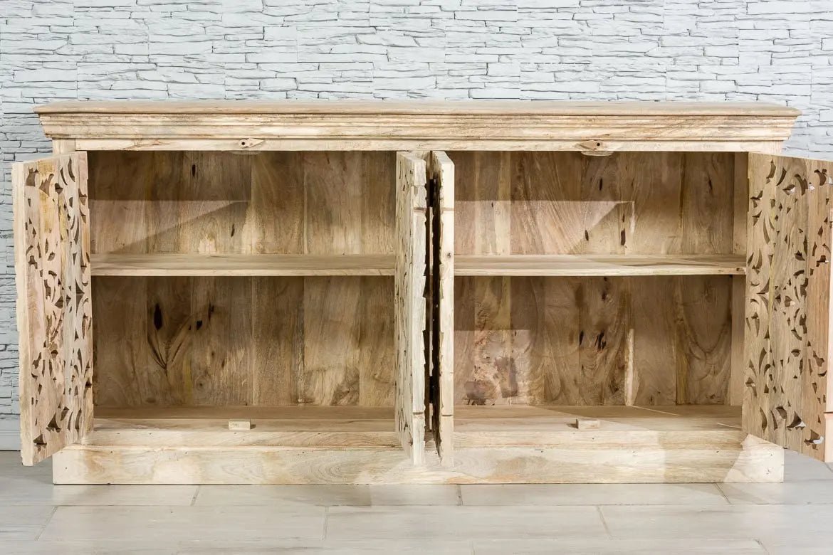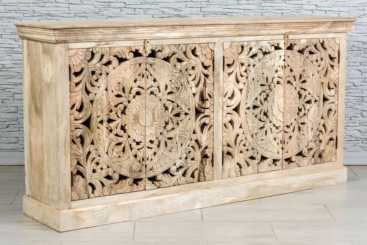 The Blue City Decor Regal Jali Carved Solid Wood Sideboard brings traditional Indian artistry and strong construction together in one beautiful furniture piece. Made from premium solid wood, this elegant sideboard showcases detailed Jali carvings on its doors, giving your home a rich and timeless decorative touch. The handcrafted patterns make every piece unique and add depth and character to any room.