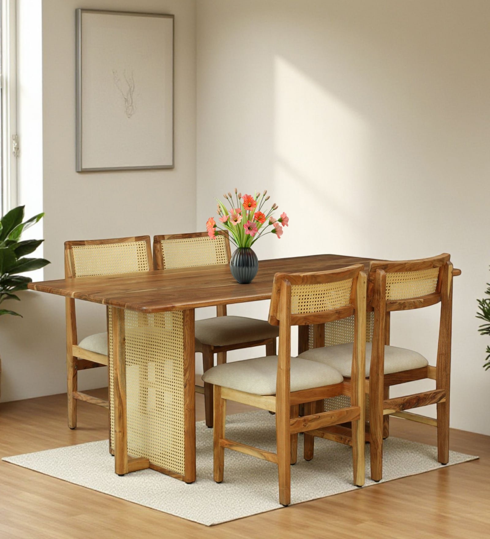 Buy Blue City Decor Urban Roots Solid Acacia 4 Seater Dining Table Set. A premium wooden dining table set crafted from solid wood, perfect for modern dining room furniture and everyday family dining.