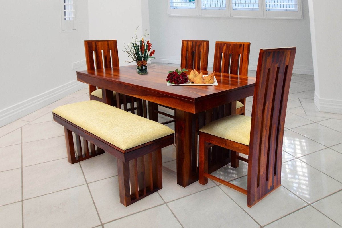 Bring timeless charm to your dining space with Blue City Decor VintageAura 6 Seater Wood Dining Suite with Bench. Crafted from premium solid wood, this wooden dining table set offers comfort, durability, and elegant dining room furniture for modern interiors.