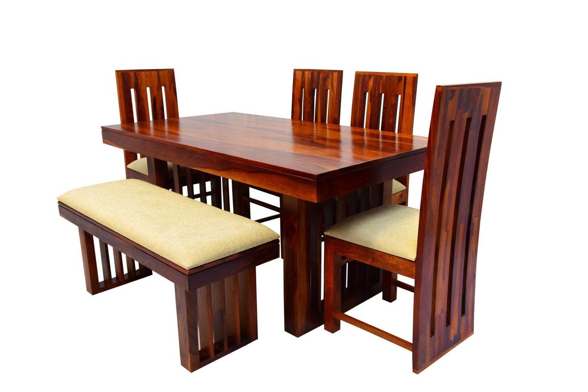 This wooden dining table set includes a spacious wooden dining table, comfortable chairs, and a matching bench that adds flexible seating. The solid wood construction ensures long-term strength, while the smooth finish highlights the natural grain of the wood, giving your dining room a rich and inviting look. The bench is ideal for compact spaces and large gatherings, making this dining set both practical and stylish.