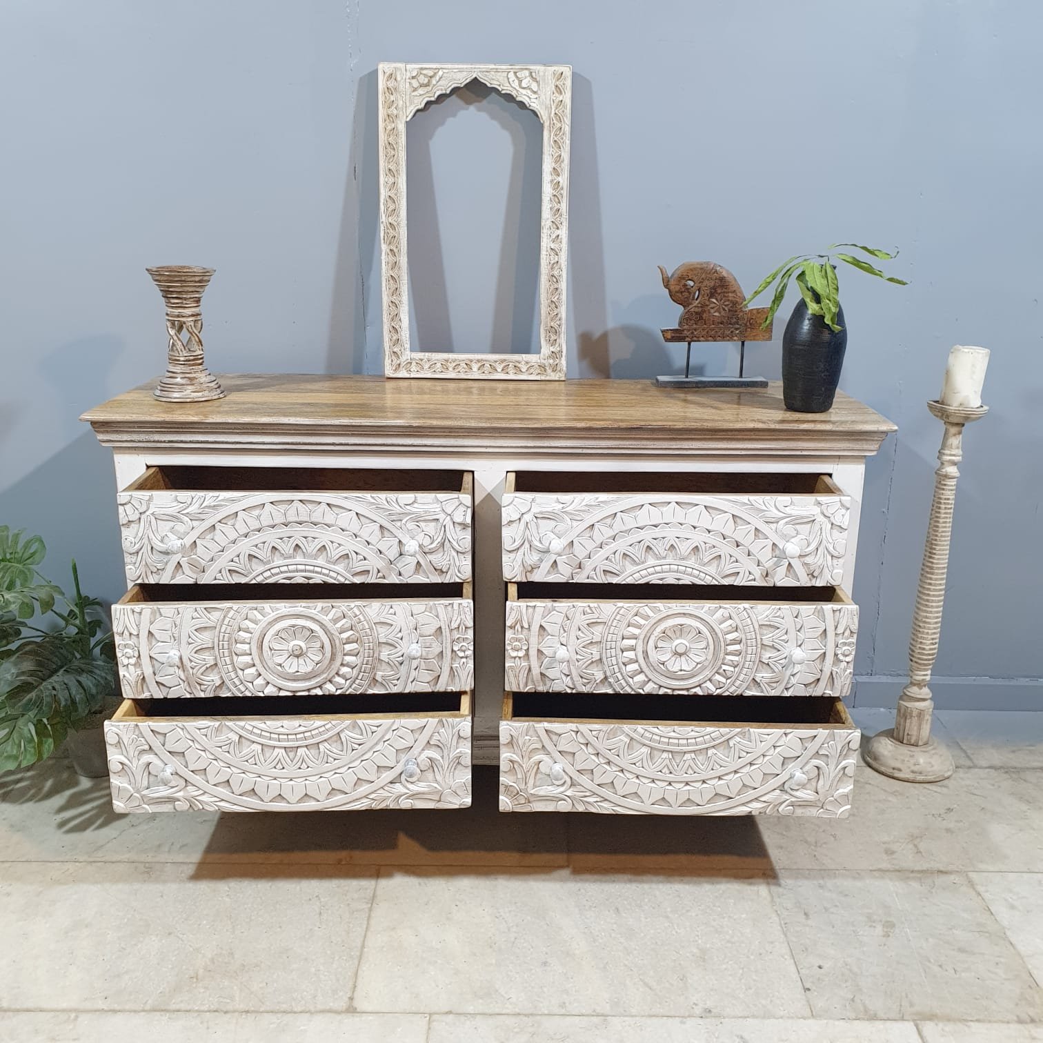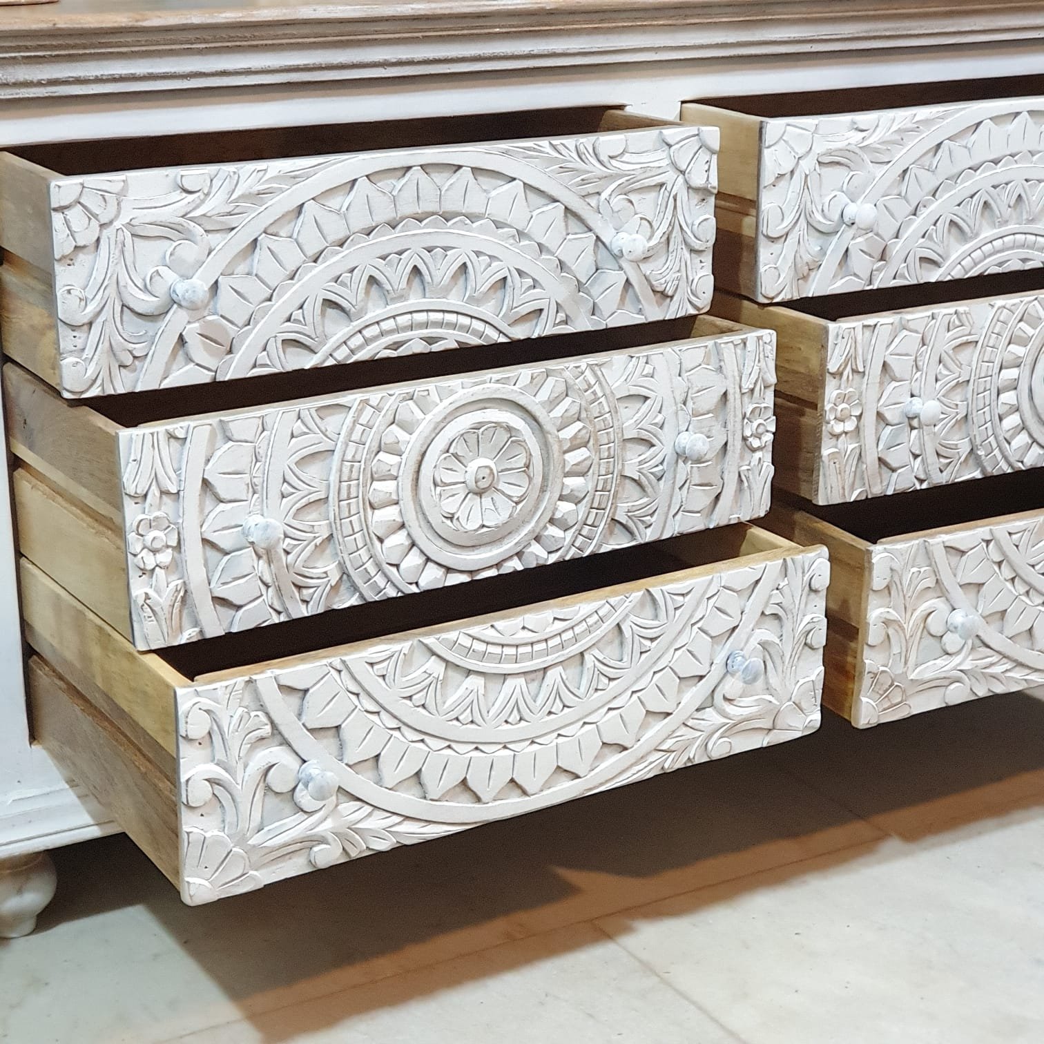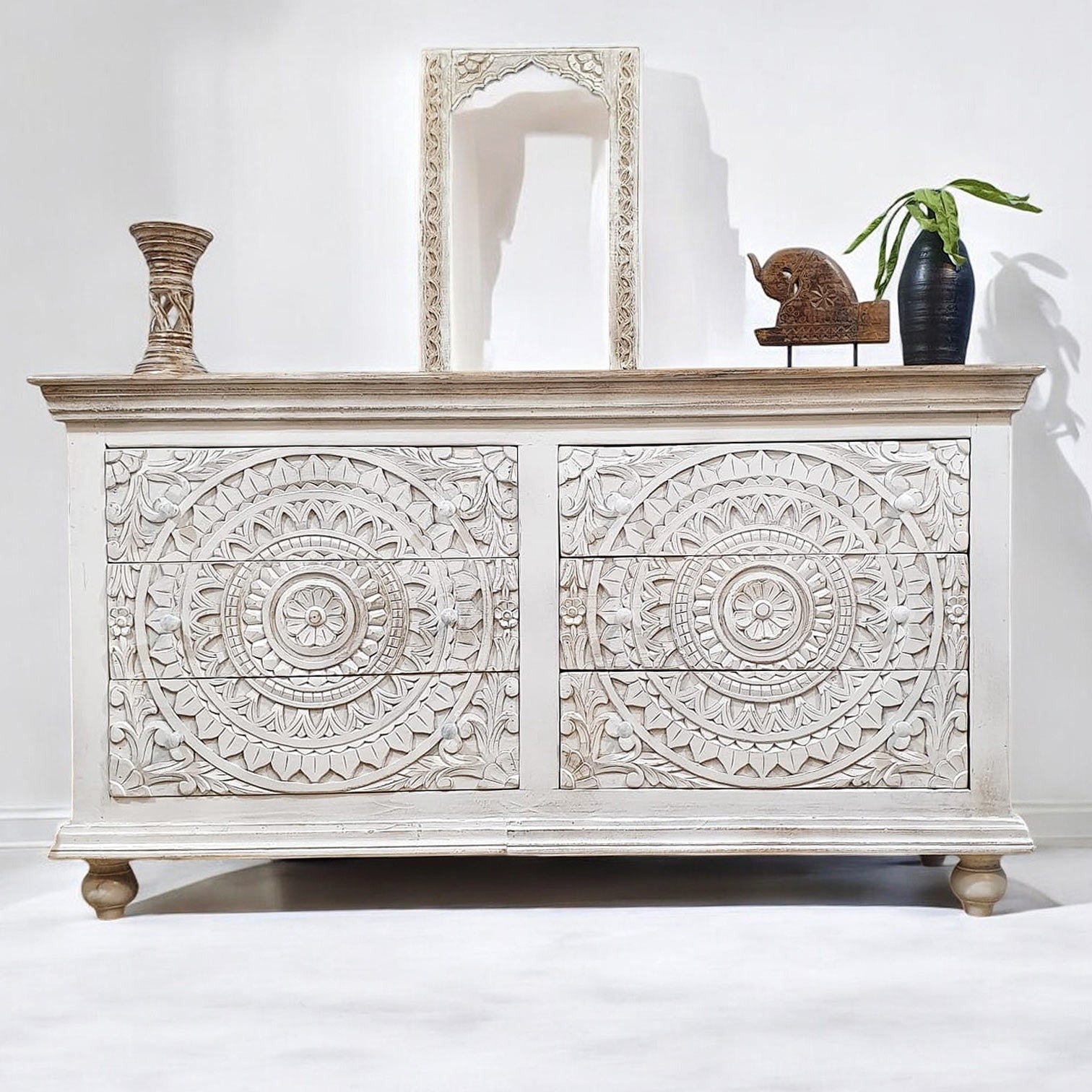The Blue City Decor White Loft Hand-Carved Wooden Chest brings a blend of artistic detail and everyday practicality to your home. Crafted from premium solid wood, this beautifully carved chest of drawers adds character to any room with its clean white finish and hand-detailed patterns. The design is simple, elegant, and perfect for both modern and classic interiors.